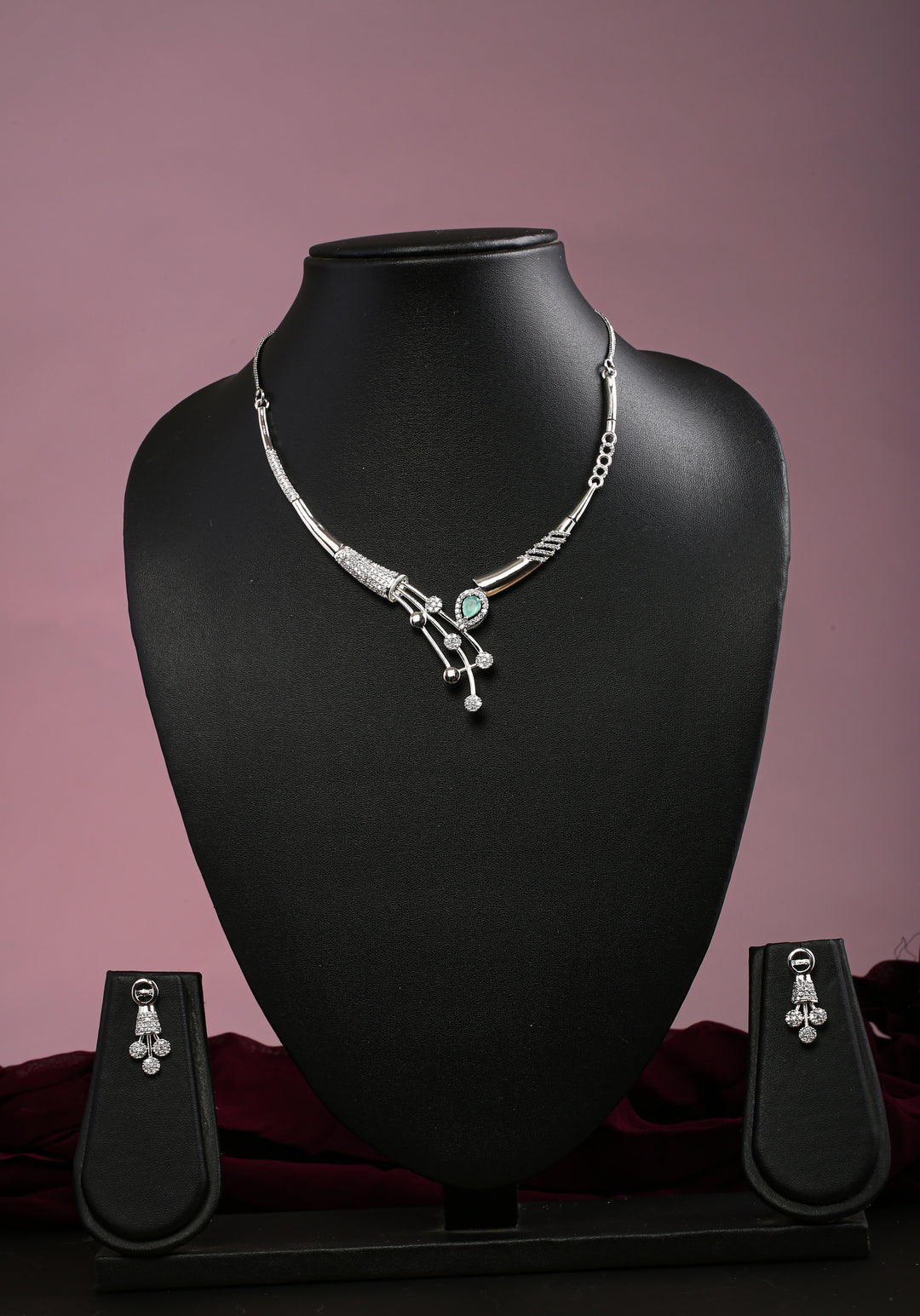 This exquisite jewelry set from Liberty Jewel features a sleek silver necklace adorned with sparkling stones and a delicate teardrop gemstone accent. The gracefully designed pendant extends into elegant dangling embellishments, adding a touch of sophistication. The matching earrings mirror the pendant’s charm with intricate stonework, making this set perfect for formal events and special occasions. Displayed against a rich blue fabric backdrop, the set exudes luxury and timeless beauty.