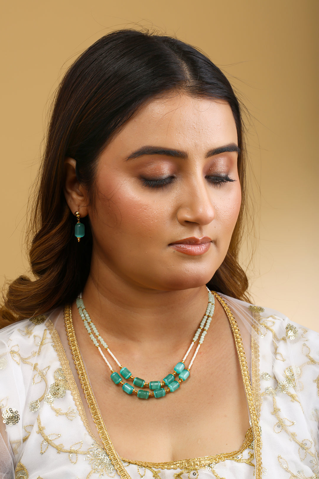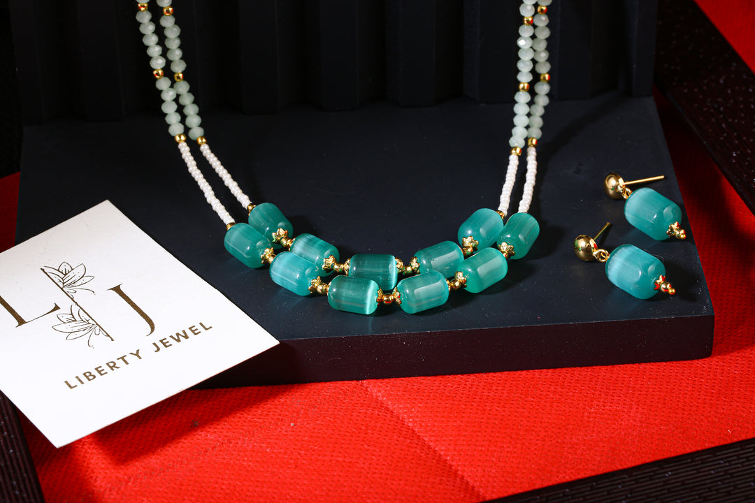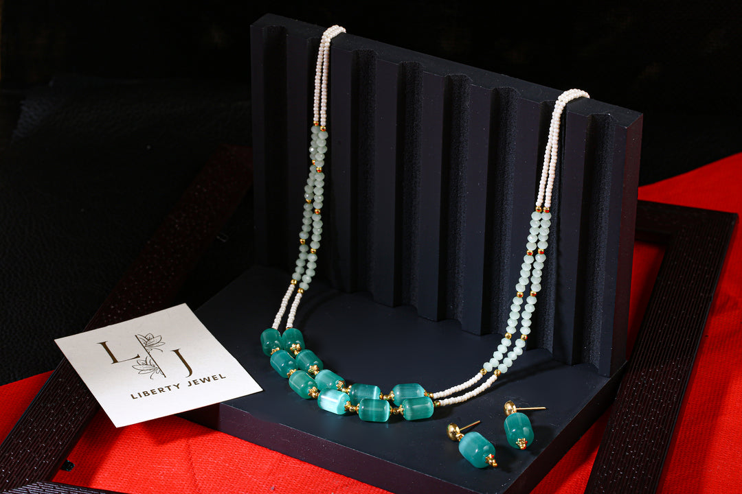 Enhance your elegance with this Graceful Green Beaded Necklace Set, featuring a dual-strand design of delicate white and green beads, accented with golden embellishments. The vibrant green centerpiece beads add a touch of sophistication, while the matching earrings complete the look. Perfect for festive occasions or casual elegance, this set brings a fresh and timeless charm to your jewelry collection.